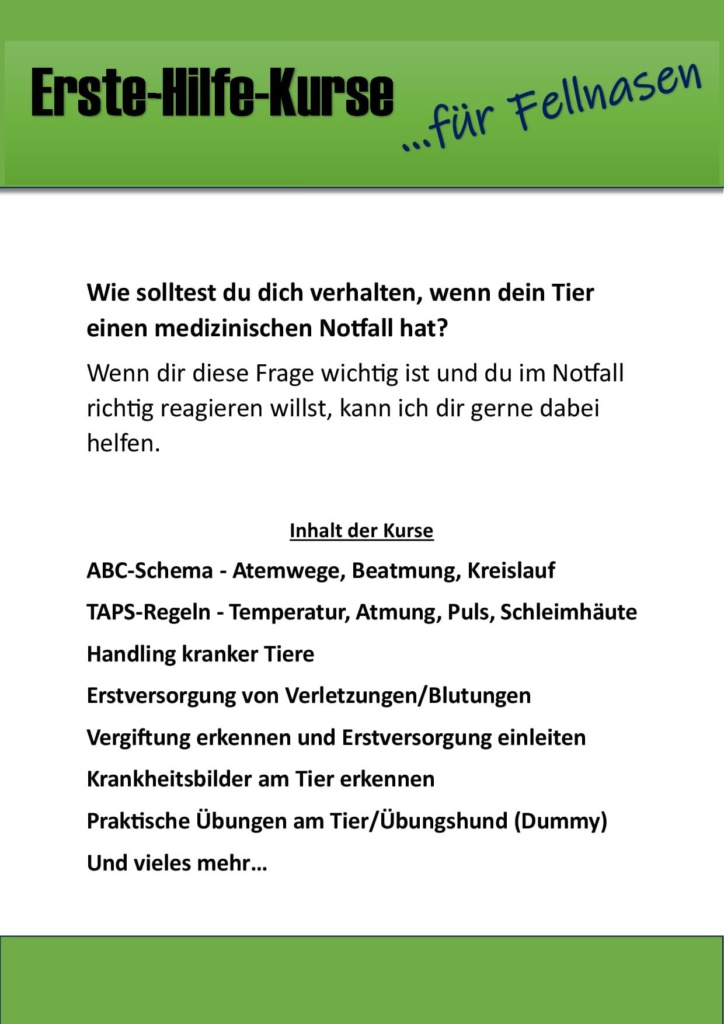 Worum geht es? Viele sind im Alltag gut organisiert, geraten im Notfall aber schnell in Unsicherheit. Genau hier setzt der Kurs an. Du lernst, kritische Situationen früh zu erkennen, richtig einzuschätzen und die ersten wichtigen Maßnahmen einzuleiten, bis tierärztliche Hilfe übernimmt.